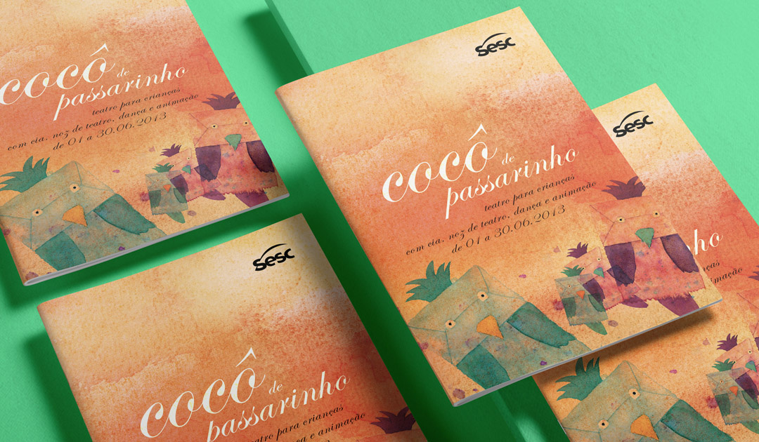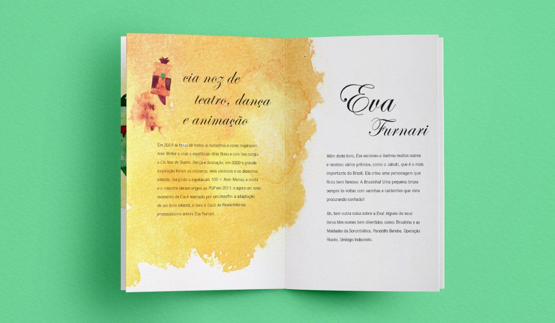 "Bird poo" (children's play). Creation of special format, character, illustrations in watercolor and graphic production for the debut of Eva Furnari's eponymous book, made by Cia. Noz de Teatro, with animation of dolls and dance. In addition to an explanatory folder, a puppet was created that is also a bag to collect the "poop of the birds" (present at the play).