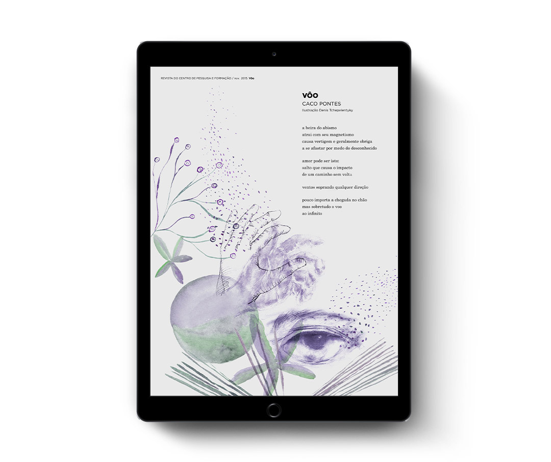 Ilustração editorial Ilustração (aquarela, pastel seco e caneta) para poema "Vôo", de Caco Pontes, pertencente à revista acadêmica digital do Centro de Pesquisa e Formação.